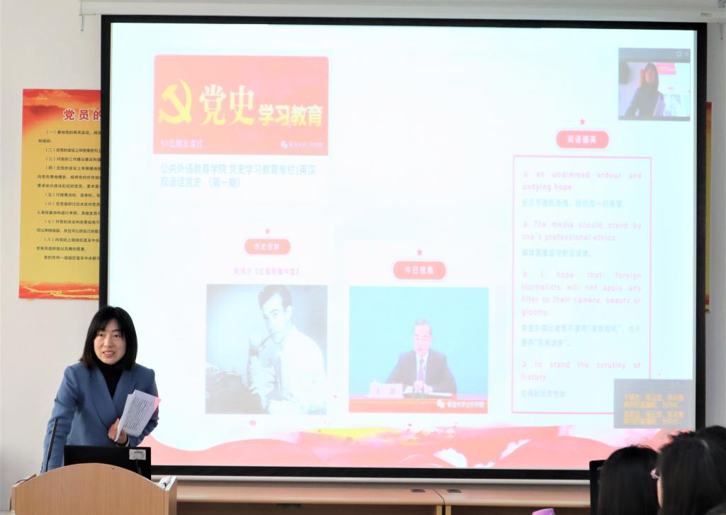 举行了党史学习教育分享交流会。会上,赵伟老师以“党史学习教育与课程思政”为题,分享了党史学习的心得体会,以及将学习所得运用到大学英语教学中的经验做法。全体教职工参加了交流会。