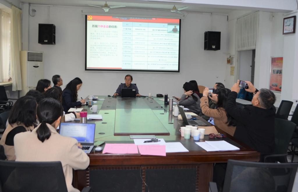思政大课堂中心主任刘正刚在睿思楼202会议室为全体教职工进行了十九届六中全会精神宣讲。学院党委理论学习中心组及教研室主任、教师代表现场参会,通过钉钉线上直播。院党委书记刘海荣主持。