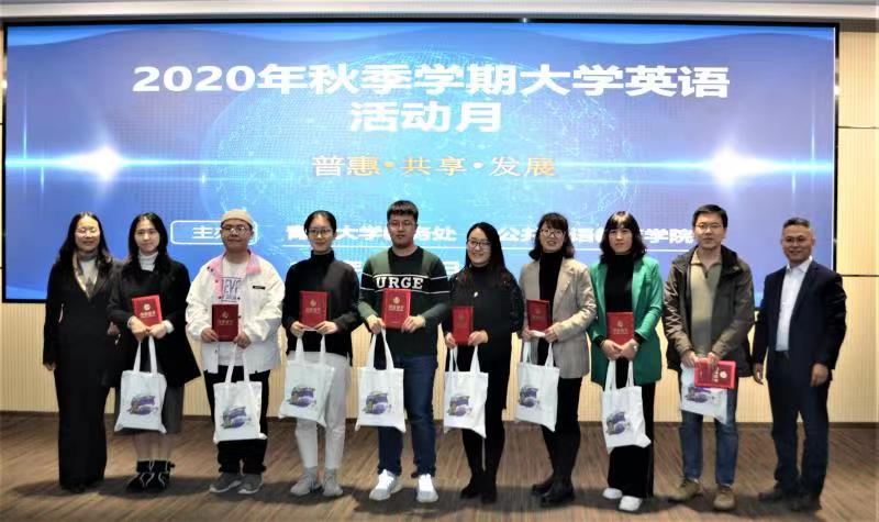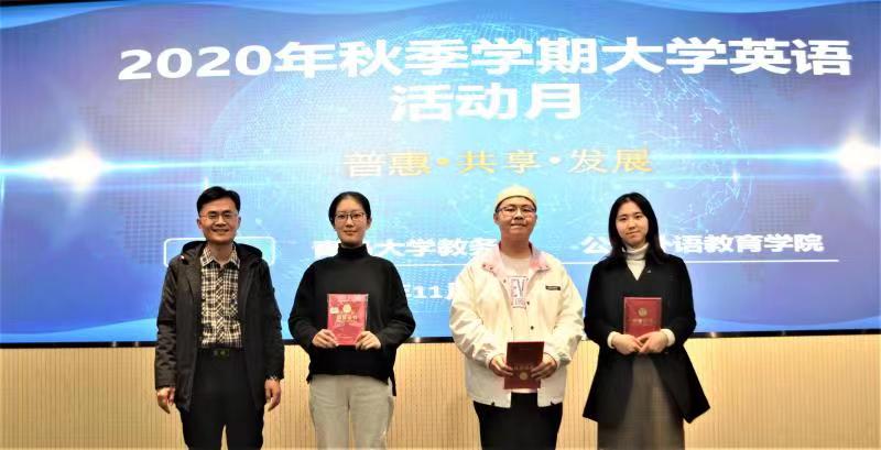 学生在2020年“外研社·国才杯全国英语大赛“山东省复赛中的获奖情况。张启春为获奖同学颁发了获奖证书,并在致辞中阐明了“大学英语活动月”的重要意义,高度评价了欧乐影视