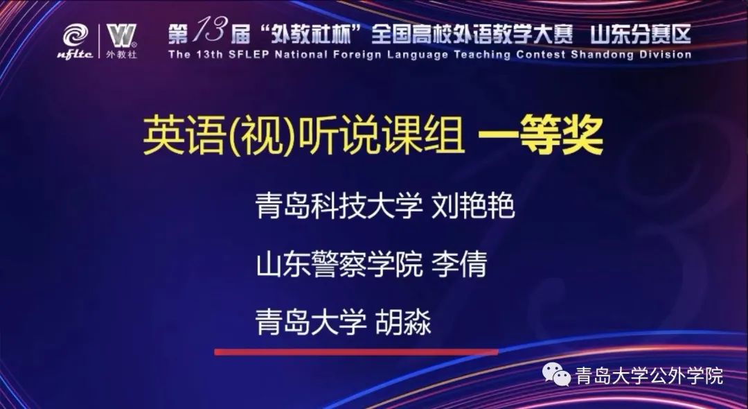 教师胡淼、张华茹分别参加了英语(视)听说课组、英语综合课组的比赛。经过初赛(提交课堂实录视频)和决赛(说课、讲课和评审提问等环节)的激烈角逐,胡淼老师斩获英语(视)听说课组一等奖,张华茹老师获英语综合课组三等奖。