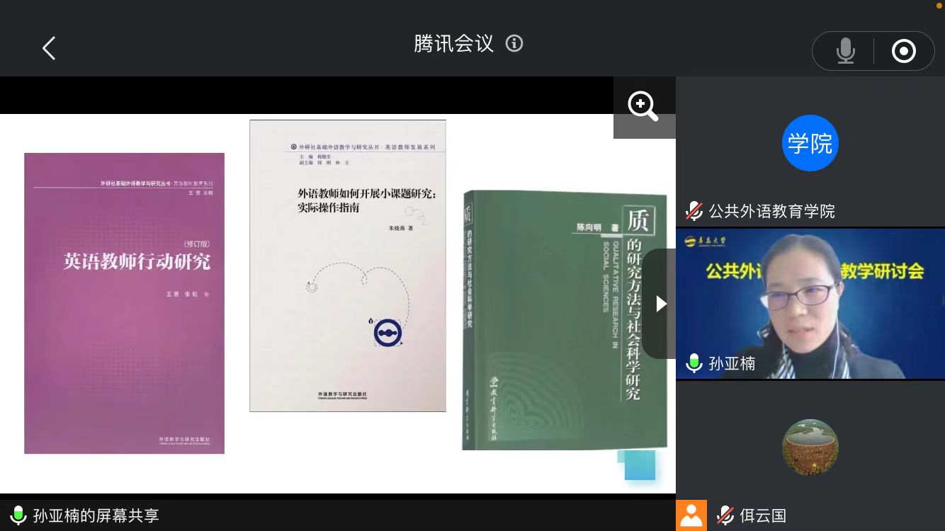 研讨会上,孙亚楠老师从学与思的角度,探讨在大学英语教师教学压力大的现实下,如何从教学中寻求专业发展。大学英语教师需要先理顺教学与教研的关系,以教学困惑为起点,多思多学多讨论,将教学的难题转化为研究的问题。在问题导向下,步步深入,从熟手教师过渡到教学研究者,做到教研同行,实现个人的可持续发展。