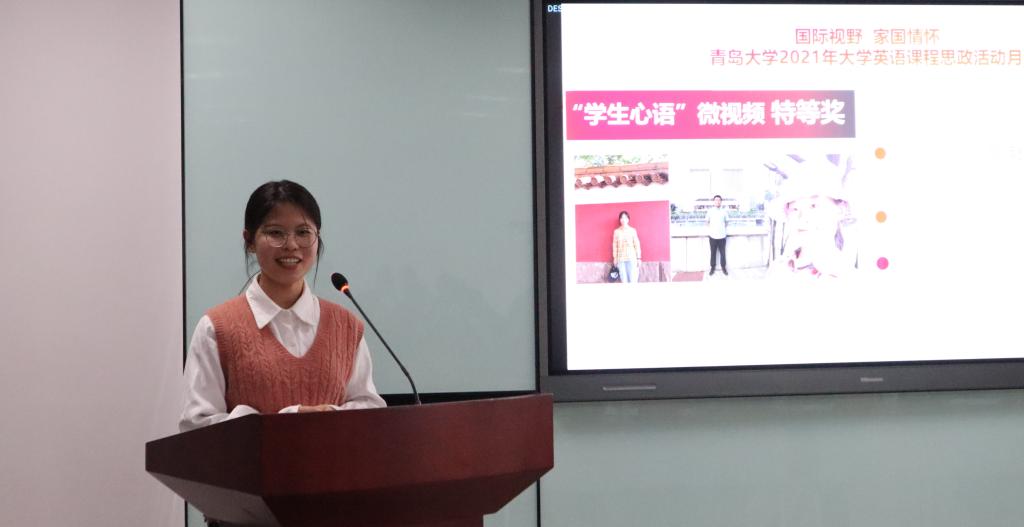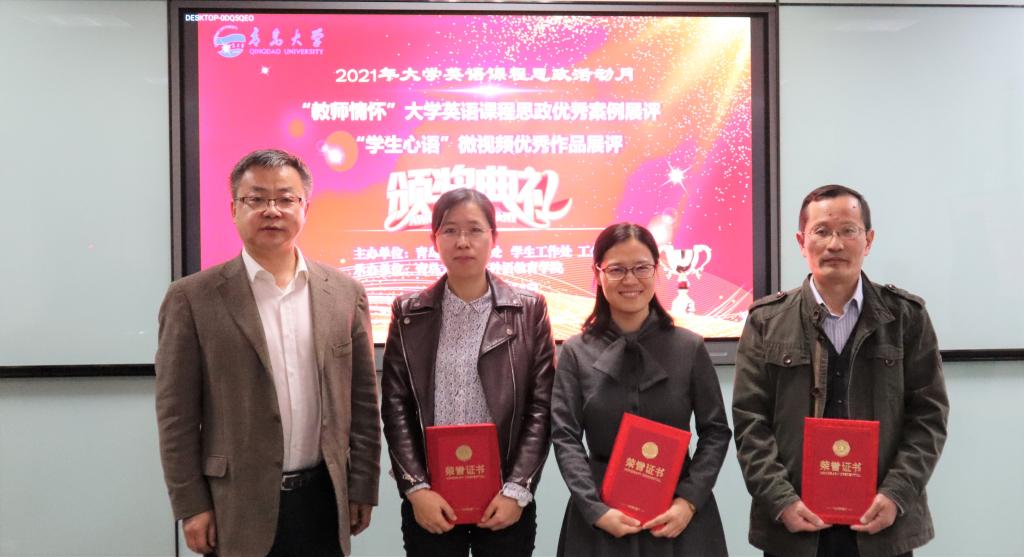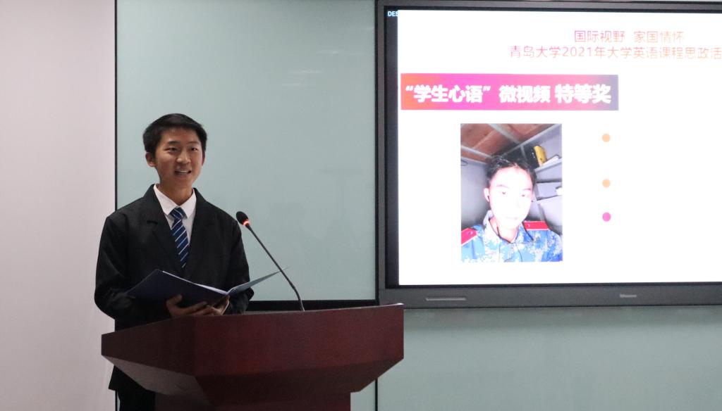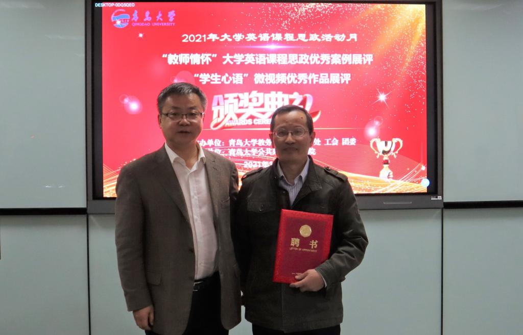 活动现场,获得全国外语课程思政优秀教学案例特等奖的于明杰老师、获得本次“教师情怀”大学英语课程思政优秀案例比赛一等奖的徐淑丽老师进行了经验分享。获得“学生心语”微视频大赛特等奖的学生团队展示了他们的获奖作品,并与指导教师一起讲述了视频背后的故事。肖江南为新成立的“大学英语课程思政研究中心”主任来庆彬老师颁发了聘书。