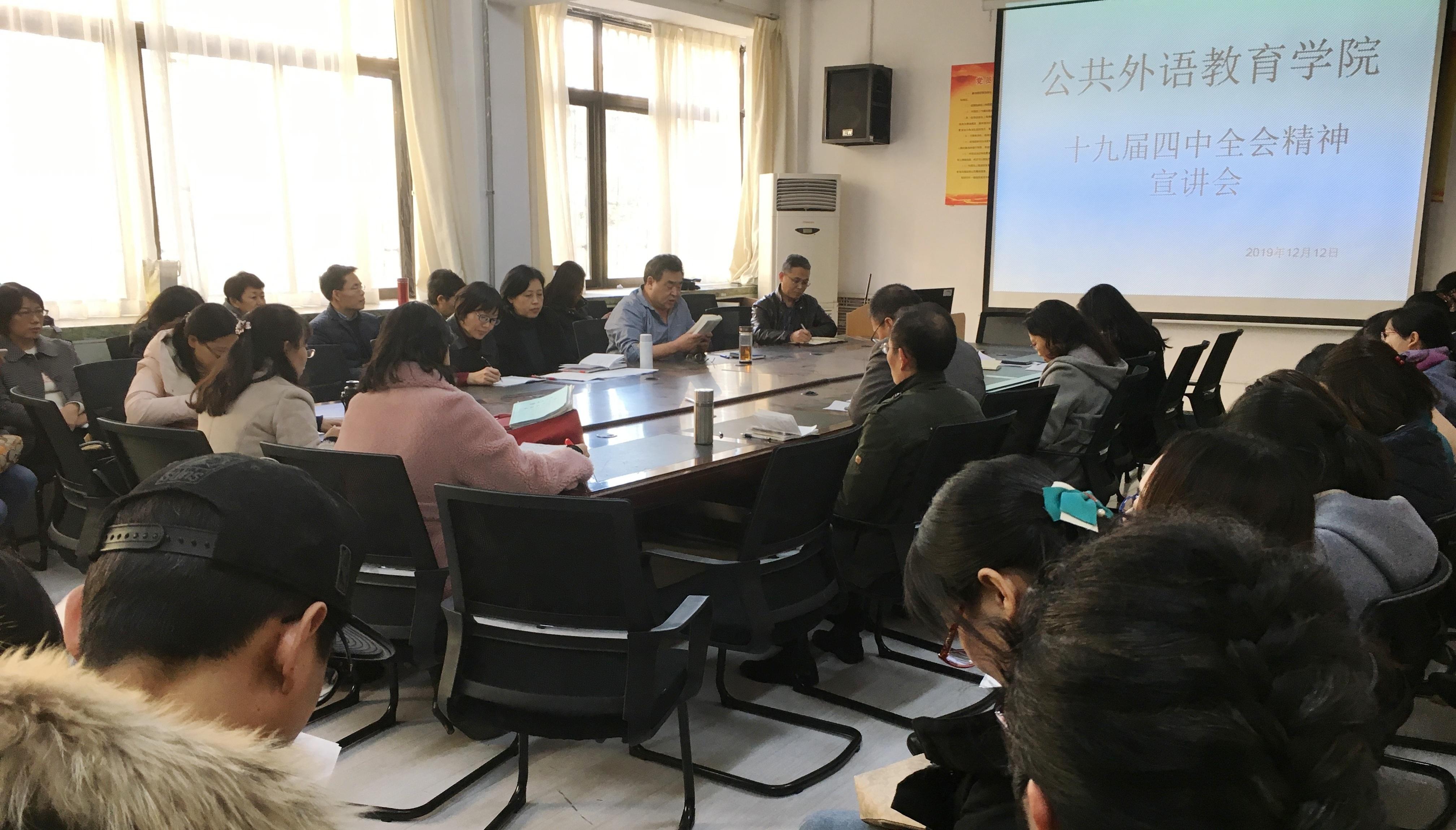 在睿思楼202会议室召开了学习贯彻党的十九届四中全会精神宣讲会。会议由学院院长、党委副书记国林祥主持,学院党委书记仲锁维主讲。此次会议是第二次全院宣讲会,全体教职工参加了学习。