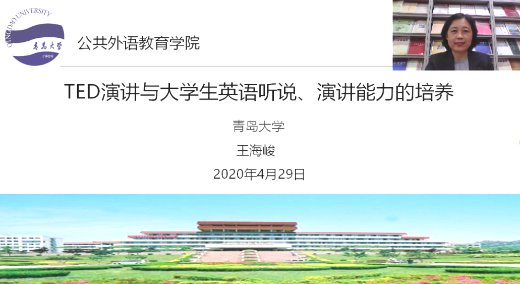4月29日,我院王海峻副院长应邀参加上海外语教育出版社举办的在线研修讲座活动,为全国1千余名高校英语教师作题为《TED演讲与大学生英语听说、演讲能力的培养》的学术讲座。