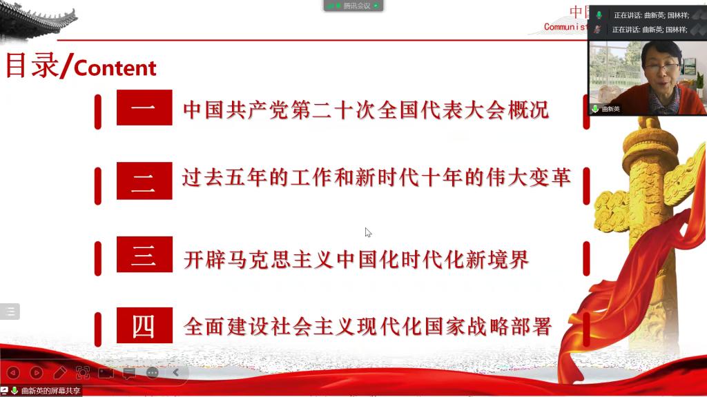 会上,曲教授从中国共产党第二十次全国代表大会概况、过去五年的工作和新时代十年的伟大变革、开辟马克思主义中国化时代化新境界、全面建设社会主义现代化国家战略部署的四个方面入手,带领大家全面学习党的二十大报告精神,深入浅出、旁征博引,对党的二十大提出的新思想新论断、作出的新部署新要求进行了系统解读和深入阐释,进一步加深了大家对习近平新时代中国特色社会主义思想世界观、方法论的认识,深化了对以中国式现代化推进中华民族伟大复兴使命任务要求的认识。