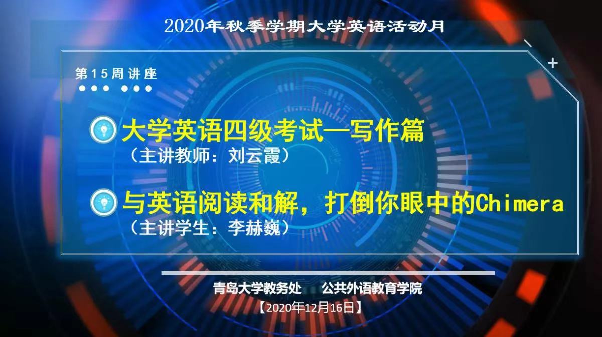 但困难没有让公外学院放低要求。院长国林祥表示,每次活动开展之前,学院都会开展学情分析,了解学生的需要,因而不管是日常训练中的听说读写译,还是四六级考试、考研英语,在英语活动月中均有所涉及。承担了大学英语四级写作的讲座任务的刘云霞,专门去调研了学生,了解他们在英语作文方面的困惑和关心的内容。负责英语听说讲座的于明杰,将学院统计的一手数据、对自己学生的问题分析和以往的听说课程教学经验相融合,打造成最终呈现出的讲座内容。欧乐影视