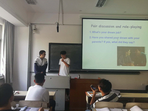 江老师以《新标准大学英语》第三册第一单元“Discovering yourself” 为题,对课程进行了精心设计。她以关于“时间”的一首小诗导入,巧妙地让同学们意识到每一个“现在”(present)都是一份天赐的“礼物”(gift)。潜移默化地引入了主题。授课过程中,江老师用优美的英语,稳定的语速以及极具亲和力的微笑,很快化解了与新班学生上课的陌生感。同时运用多媒体课件为学生创设生动有趣的学习情境,教学活动丰富多样,学生们在她的感召下积极配合回答每一个问题,师生互动十分热烈。整个课堂气氛活跃,教学效果良好,充分展示了大学英语教师扎实的基本功和与时俱进的教学理念与创新精神,获得了观摩教师的一致好评。