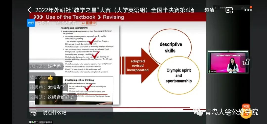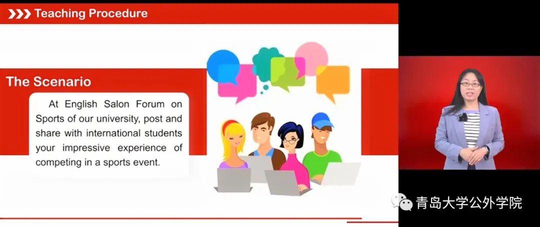 全国半决赛设置教学设计介绍、课堂教学展示和现场问答三个环节。李晓敏教师团队在说课环节应用POA“产出导向”教学法,创新《新标准大学英语综合教程2》第三单元教学设计,体现教师为主导、学生为主体、学习为中心、混合式学习、全人教育等先进教学理念,在实现知识、语言能力教学目标的同时,圆满完成培养学生奥林匹克体育精神、树立多元文化观、提升跨文化意识和交际能力的育人目标。在教学展示环节,参照POA的“促成环节”,深度挖掘和利用教材资源,将思政育人内容与语言教学有机结合,循序渐进引导学生进行积极有效的学习活动,为学生完成写作产出任务提供脚手架。现场回答问题思路清晰、反应迅速、阐释充分,受到评委一致好评。