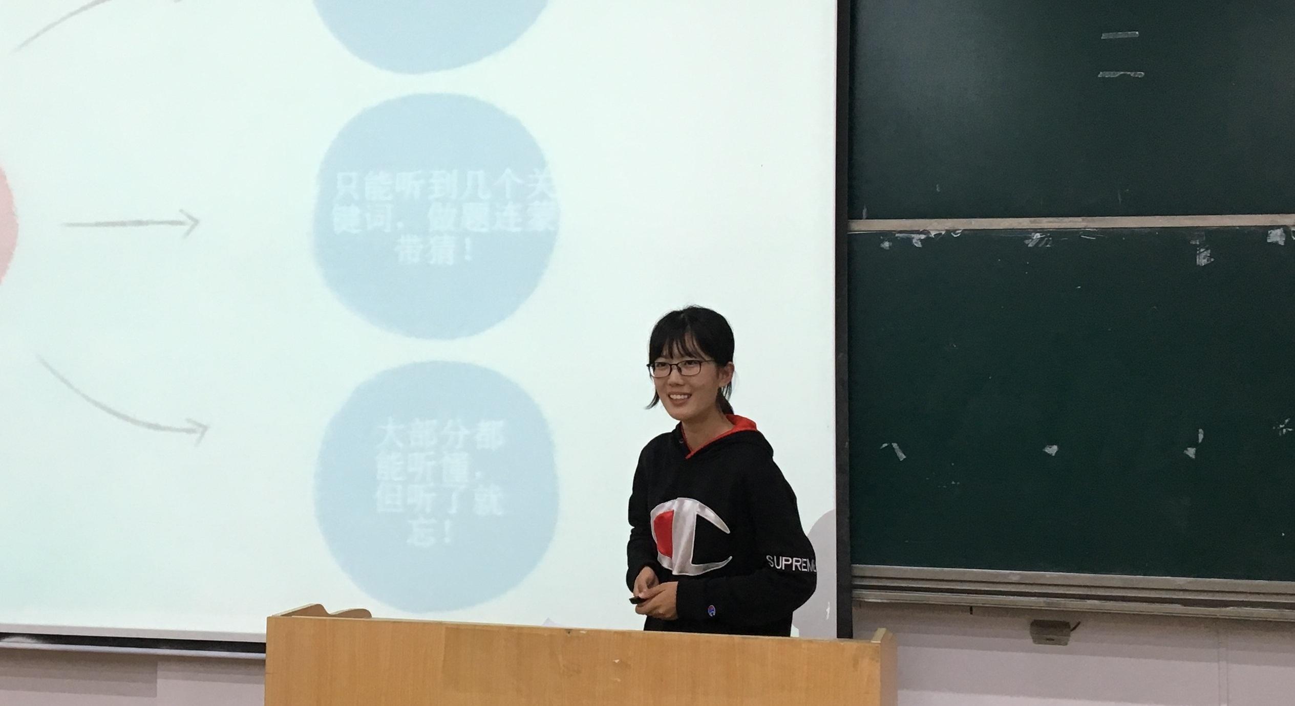 医学部2018级临床医学专业的戈瑶以风趣幽默的语言与大家分享了她自己总结的“三步听力练习法”:Talk More 、Mimic 、Do Not Be Shy。讲座最后不少学生面露疲惫,“但是戈瑶一上场就把大家的热情唤回来了,幽默风趣又一点不耽误给大家讲授方法,给整场讲座画了一个圆满的句号。”