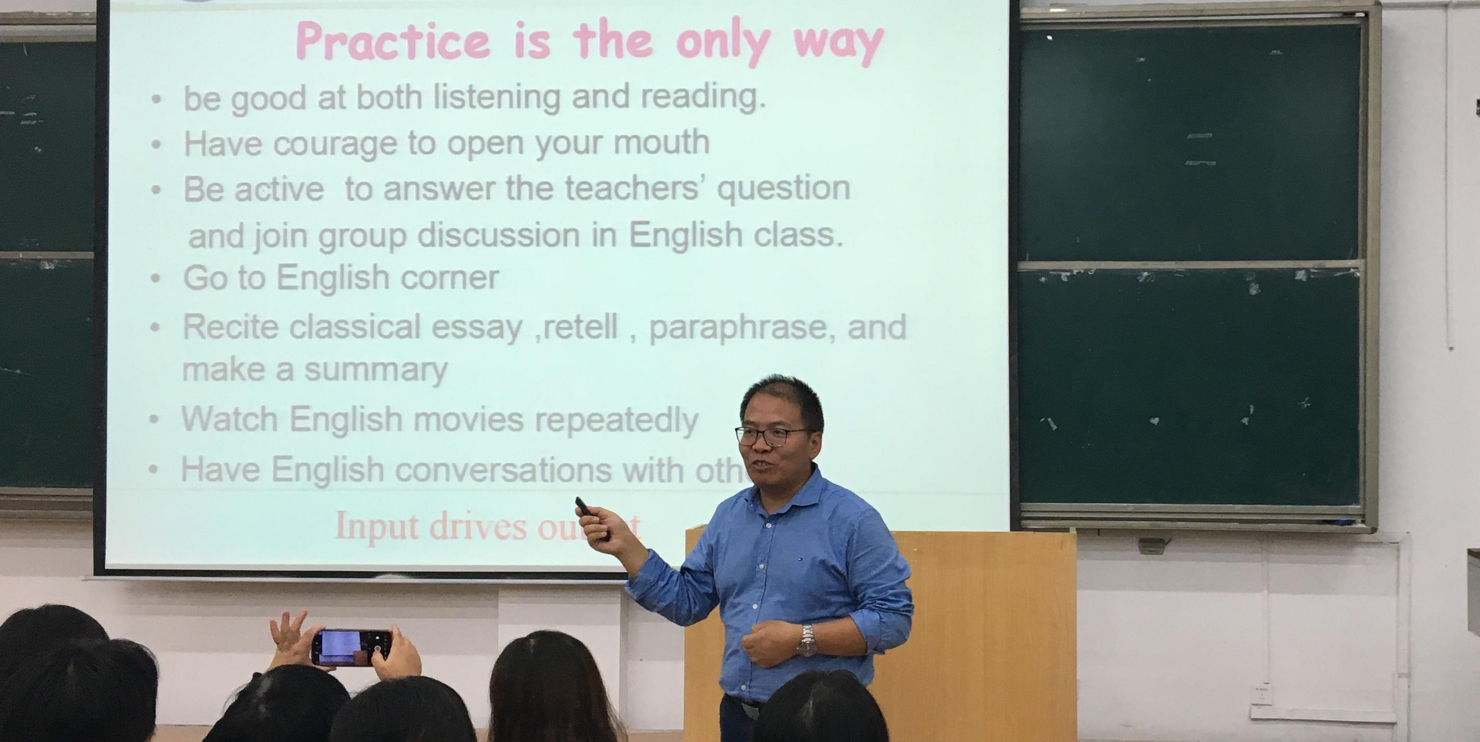 2019级新生量身打造,由三位教师和两位学生主讲。张学刚老师首先总结了大一新生在大学英语学习初期面临的困难和挑战,并结合大学英语教学目标,分别从听、说、读、写、译五个方面为同学们作了学习方法和技巧的指导。江美娜和于明杰两位老师则针对英语听力和口语的学习,向同学们提出了多种建议。于明杰鼓励同学们在日常生活中大胆地用英语互相交流:“不好意思跟外教或外国同学沟通似乎是很多学生的‘通病’,其实积极参与外国老师或同学组织的活动和一些英语演讲比赛,会让自己慢慢由被动变为主动。”