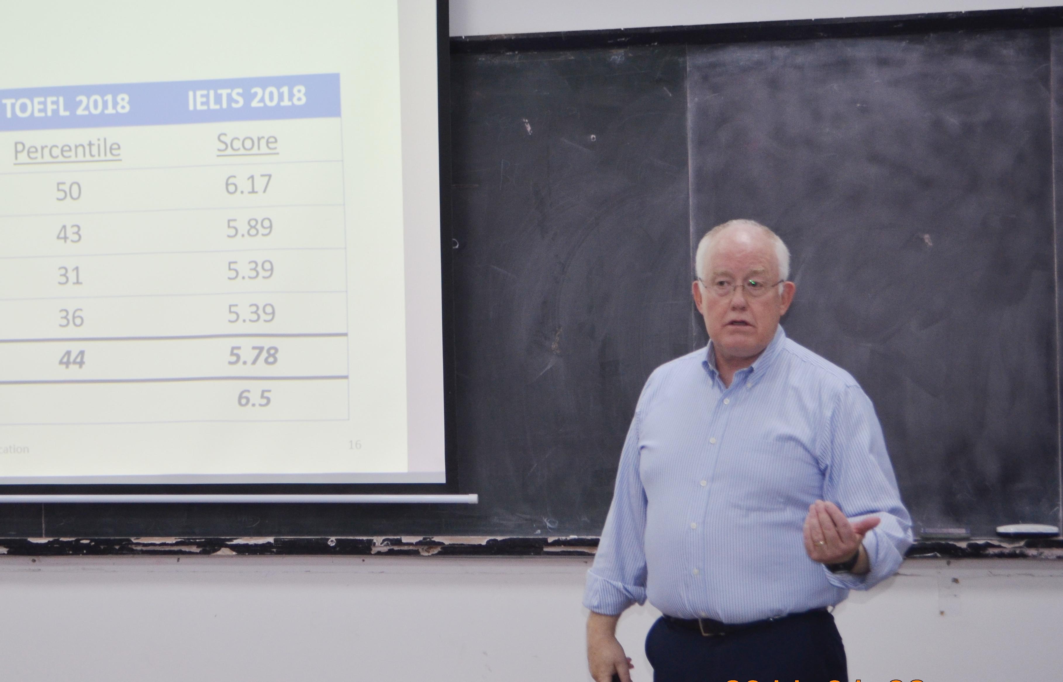 的资深外教David Swan在第十周带来了以托福和雅思备考为主题的讲座,他首先向大家展示并分析了最近几年有关雅思和托福考试的数据变化,接着介绍了多种考试技巧。此外,David Swan认为考试也是一场关于时间的较量,合理分配做题时间尤为重要。讲座最后还设置了师生交流环节,多位学生提出各自的疑问,由外教David Swan及两名托福考试取得高分成绩的学生进行现场解答。