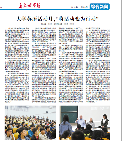 联合打造的“大学英语活动月”,于10月23日晚启动。活动集结专业教师团队和多名优秀学生,分别在浮山校区和金家岭校区陆续开展。三个多周的活动延续了春季学期“活动月” “普惠、共享、发展”的主题。“普惠”意为将学习与进步的机会惠及所有有需求的师生;“共享”即为教师与学生、教师与教师、学生与学生之间进行英语学习资源、方法和经验的共享;“发展”则包括两个方面:发展学生的学习能力和老师的教学能力。