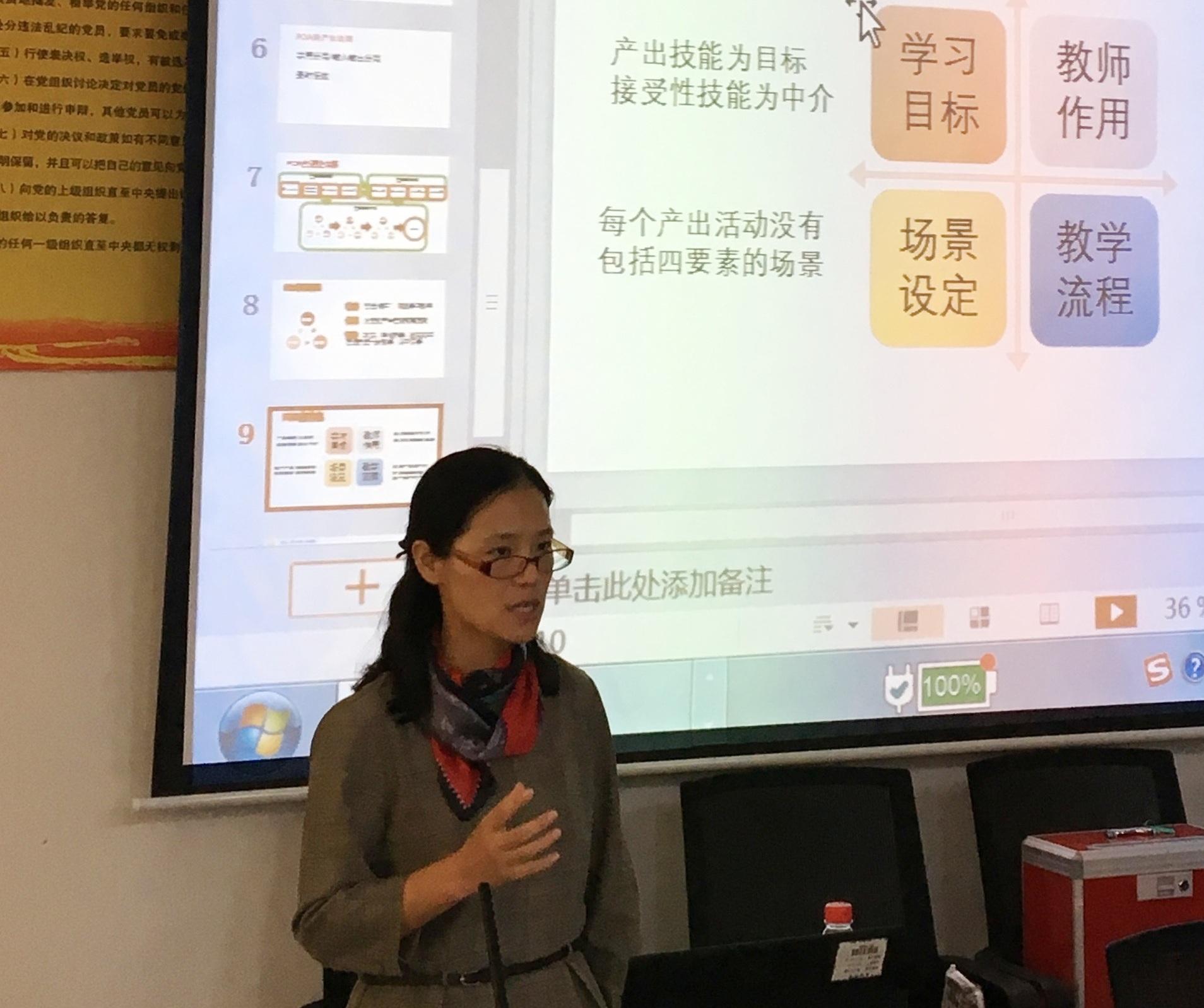 孙亚楠做了《基于“产出导向法”的英语教学与研究》的分享,介绍了产出导向法(POA)的发展历程、产生动因、理论体系,展示了产出导向法在学习目标、教师作用、场景设定和教学流程上的特色。
