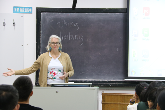 外教Sterling Larsen、Carol Larsen和Ivan Franck三位老师带领同学们一起学习了户外远足英语,分享了户外活动经历。