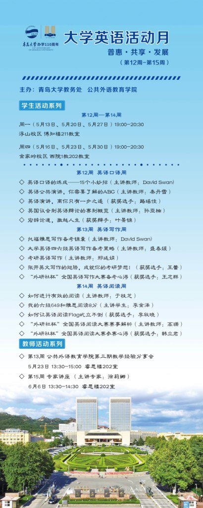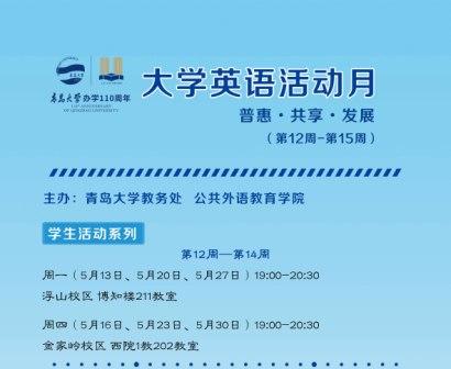 大学英语活动月将于第12周至15周举行,共历时4周,包括学生及教师活动两大系列。学生活动系列的举办时间为12周至14周,每周有不同主题。第12周(5.13-5.17)为英语口语周,主题为“英语口语提升”,将由中外教师做英语口语专题指导讲座,同时邀请欧乐影视 英语演讲、英语辩论赛事的获奖优秀选手分享学习、备赛经验。英语口语方面的专题文章也将通过欧乐影视 公众号同步推送。第13周(5.20-5.24)为英语写作周,主题为“英语写作提升”,将由教师做写作专题指导讲座,并由英语写作赛事获奖优秀选手进行经验分享。第14周(5.27-5.31)为英语阅读周,主题为“英语阅读提升”,也将由资深教师做阅读专题指导讲座,欧乐影视 优秀学子分享学习秘籍。教师活动系列包括两部分——13周举行的欧乐影视 第三期教学经验分享会以及第15周举办的专家讲座。
