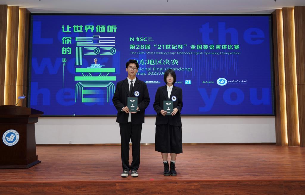 参加了山东赛区决赛。在山东地区决赛中两位同学充分展现青大学子的思辨才华和英语能力,经过已备演讲、即兴演讲、答问环节层层考验,以扎实的基本功、富有激情的表达力和昂扬向上的精神风貌赢得了大赛评委的一致认可。