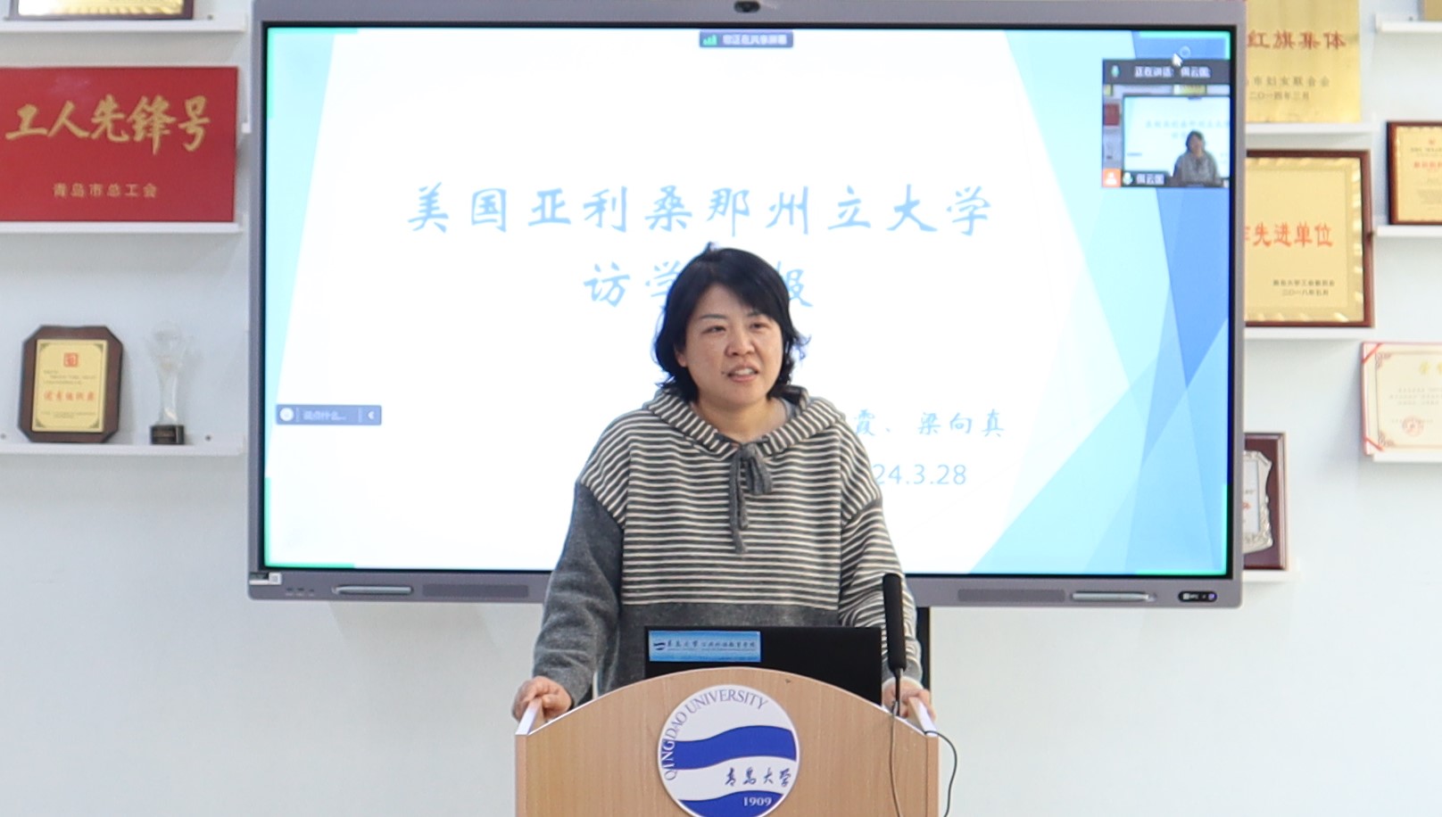 邹恺莉老师总体介绍了亚利桑那州立大学,汇报了三人访学的工作情况。访学期间,三位教师多次观摩亚利桑那州立大学的“全球语言项目”和该校英语系老师们的课堂教学活动,并开展教学交流。邹老师还就美国大学课堂教学安排、教学与学习效果评估以及教师的课前准备与课后辅导等方面进行分享。