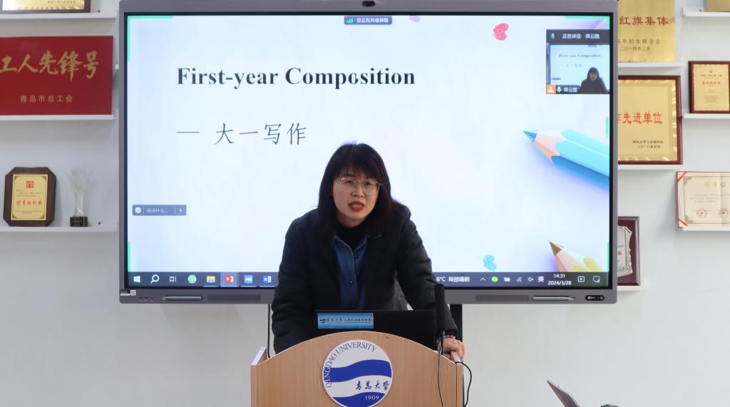 刘云霞老师介绍了亚利桑那州立大学的本科课程《大一写作》。《大一写作》是该大学的一门本科必修课程,旨在培养本科生的学术写作能力,为其大学期间的学术活动打基础。刘老师着重介绍了该课程的大纲要求,并以一个教学项目为例介绍了课堂组织、任务的要求和步骤、学生合作、对学生思辨能力的培养等。