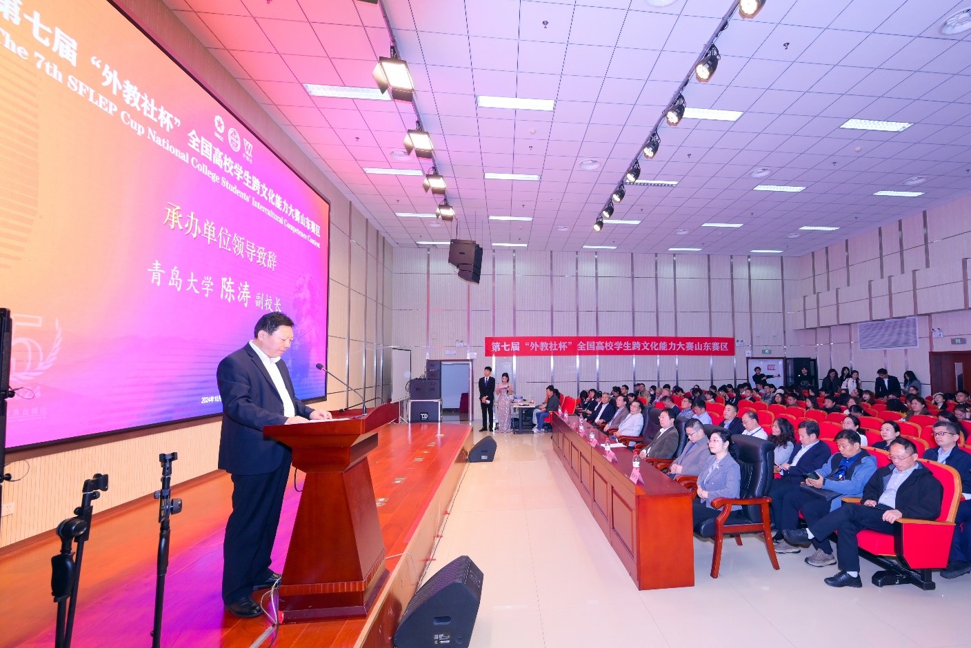 党委常委、副校长陈涛、上海外语教育出版社副总编张宏分别代表山东赛区承办单位和全国组委会致辞。颁奖嘉宾为各获奖团队颁发了奖项。