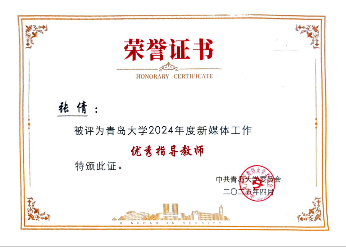 荣获“宣传思想文化工作网站建设先进单位”荣誉称号,张倩同志荣获“新媒体工作优秀指导教师”荣誉称号。