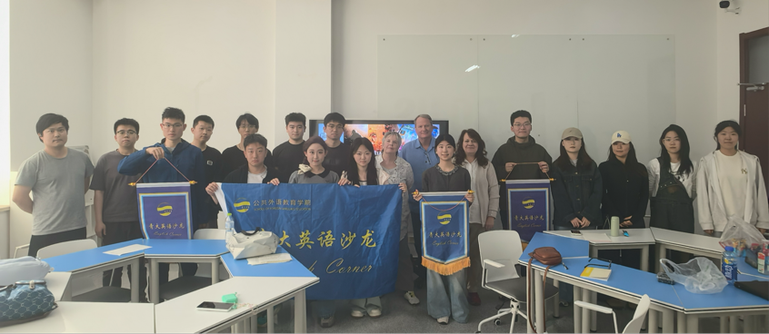 2026年4月23日下午,第44期青大英语沙龙在浮山校区西院慧创空间201室成功举办。本次活动以“Film Appreciation”为主题,外籍教师 Catherine Porter、Scott Stephenson、Debra Stephenson 与校内英语爱好者共同参与。欧乐影视