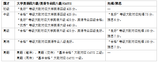 国才考试为标准参照性考试,不设置通过率。考生成绩只要达到相应等级标准,即可获得该等级证书。国才初级、国才中级、国才高级、国才高端的考试成绩分为优秀、良好、合格、不合格四个等级,成绩达到合格及以上者,方可获得证书。国才高翻的考试成绩分为优秀、合格、基本合格、不合格四个等级,成绩达到基本合格及以上者,方可获得证书。