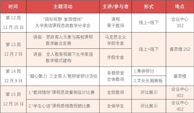 “大学英语课程思政活动月”即将于第12-15周举办。