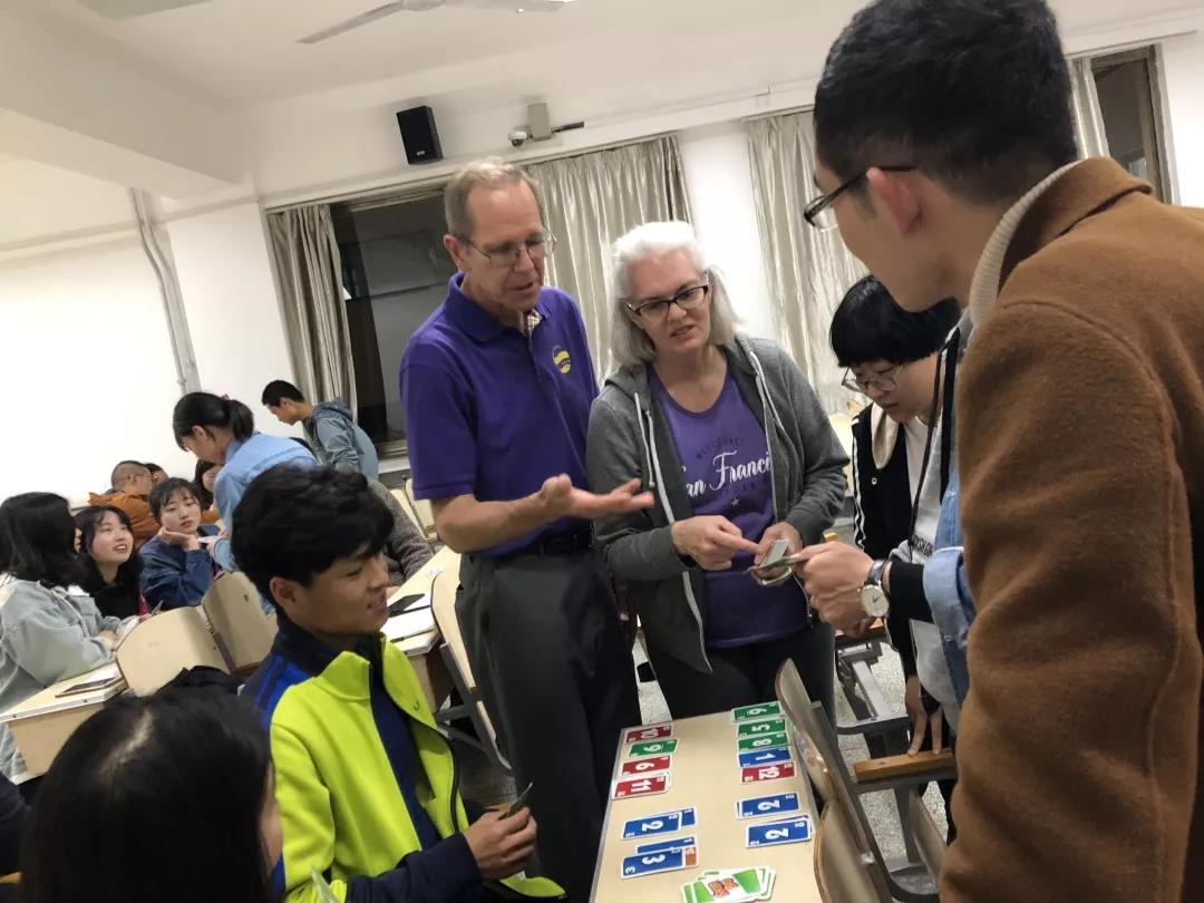 Sterling Larsen和Carol Larsen老师主持了本次活动。活动现场,Scattergories、Jeopardy、Skip-Bo……一个个益智游戏令人兴趣盎然,外教老师细心讲解游戏规则,生动形象的肢体语言更是激发了同学们的参与热情。现场氛围活泼轻松,大家积极交流、集思广益、收获满满。