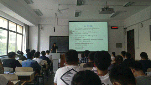 江老师以《新标准大学英语》第三册第一单元“Discovering yourself” 为题,对课程进行了精心设计。她以关于“时间”的一首小诗导入,巧妙地让同学们意识到每一个“现在”(present)都是一份天赐的“礼物”(gift)。潜移默化地引入了主题。授课过程中,江老师用优美的英语,稳定的语速以及极具亲和力的微笑,很快化解了与新班学生上课的陌生感。同时运用多媒体课件为学生创设生动有趣的学习情境,教学活动丰富多样,学生们在她的感召下积极配合回答每一个问题,师生互动十分热烈。整个课堂气氛活跃,教学效果良好,充分展示了大学英语教师扎实的基本功和与时俱进的教学理念与创新精神,获得了观摩教师的一致好评。