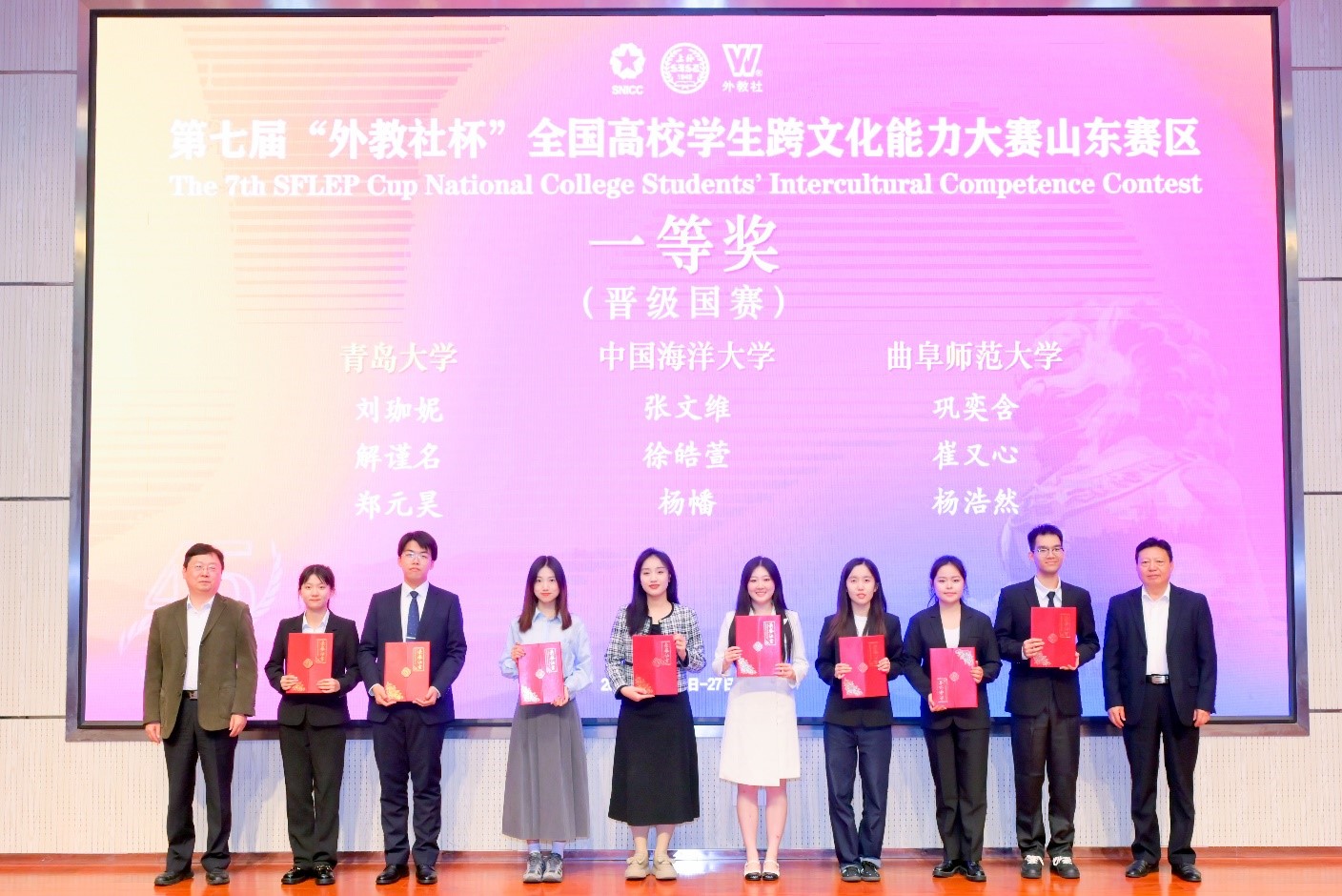 党委常委、副校长陈涛、上海外语教育出版社副总编张宏分别代表山东赛区承办单位和全国组委会致辞。颁奖嘉宾为各获奖团队颁发了奖项。