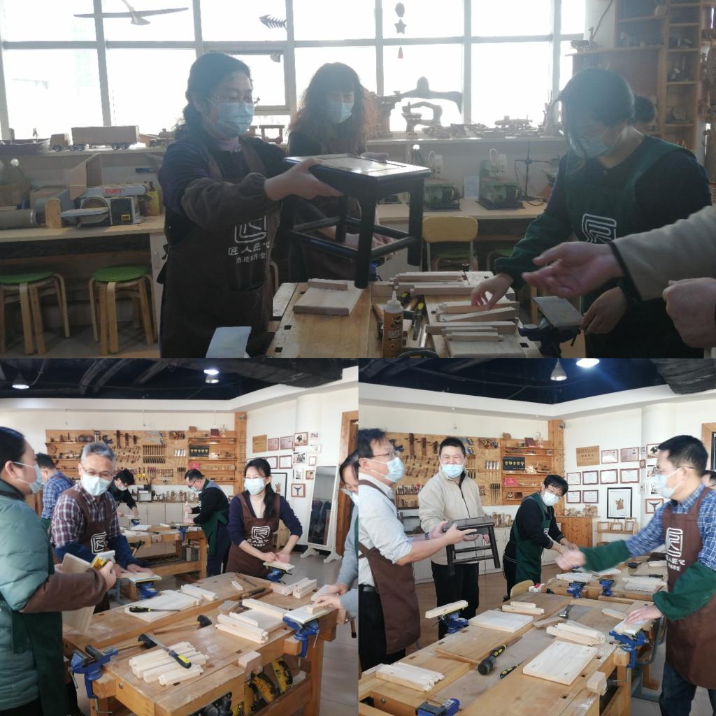 本次活动中,学院教职工走进“鲁班木作堂”,在木工专家的讲解指导下亲手制作木工小板凳。通过木块打磨、榫卯拼接、乳胶加固、插接成型、后期修整等工艺流程,大家都成功地完成了自己的作品。