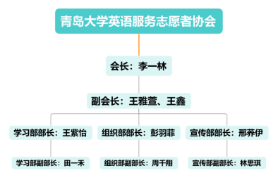 英语服务志愿者协会会长,王雅萱、王鑫为协会副会长,王紫怡、彭羽菲、邢荞伊分别为协会学习部、宣传部和组织部部长。
