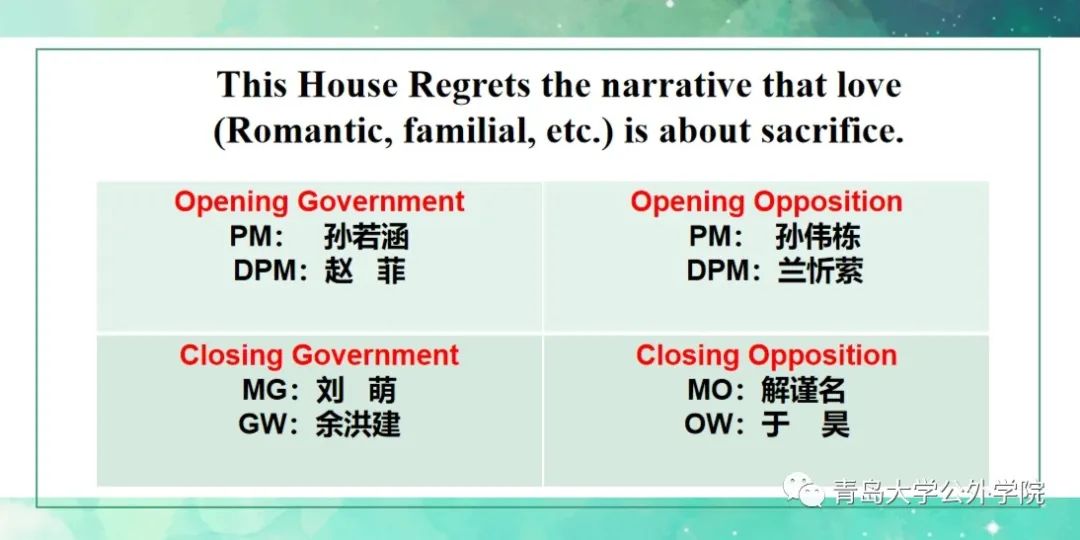 经过充分讨论合议,两位裁判认为Opening Government(孙若涵、赵菲)赢得本场比赛。