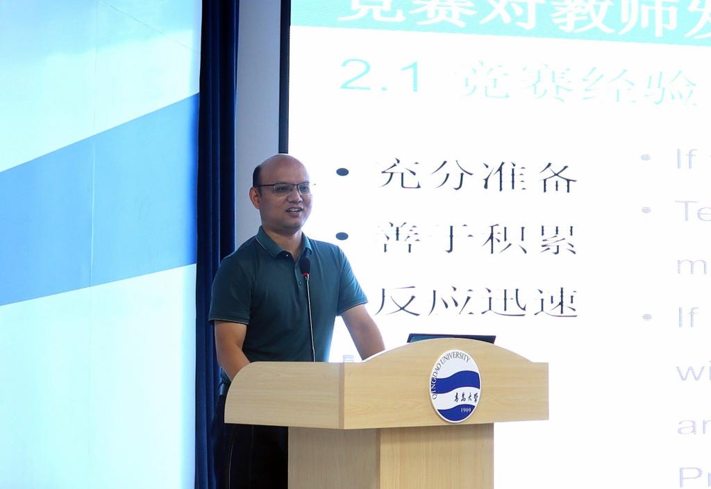 谭洪进从赛前准备、平日积累、临场反应、课件制作等角度分享了参加“外教社杯”全国高校外语教学大赛和外研社“教学之星”大赛的获奖经验,分析了教学竞赛在夯实语言功底、提升教学设计能力、提高智慧教学素养、落实课程思政等方面对教师发展的引领作用,通过具体教学案例展示了《新标准大学英语(第三版)综合教程》的产出导向、思政融合、智慧赋能的教材特色和应用情况,并就老师们提出的教学问题进行了交流和沟通。