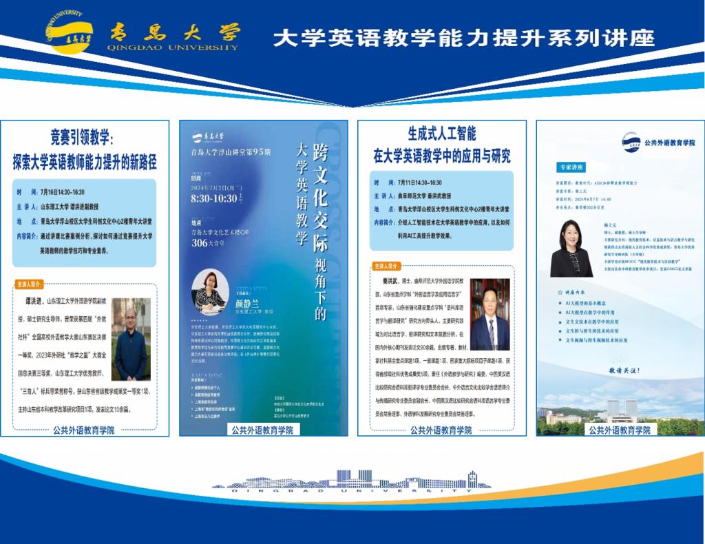 邀请省内外专家就跨文化交际、生成式人工智能、教学竞赛与教师发展等专题开展了多场讲座。华东理工大学颜静兰教授深入浅出地介绍了跨文化交际的理论与实践,强调了在全球化背景下培养学生跨文化能力的重要性,为教学实践提供了新的思路。曲阜师范大学秦洪武教授与欧乐影视